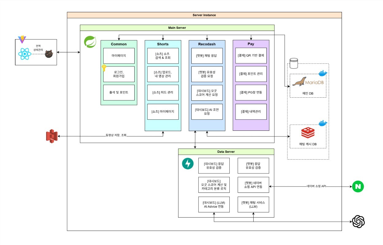 - 로그인/회원가입, 결제 위젯, 마이페이지, 숏폼(Shorts), 대시보드, AI 추천 등을 제공.